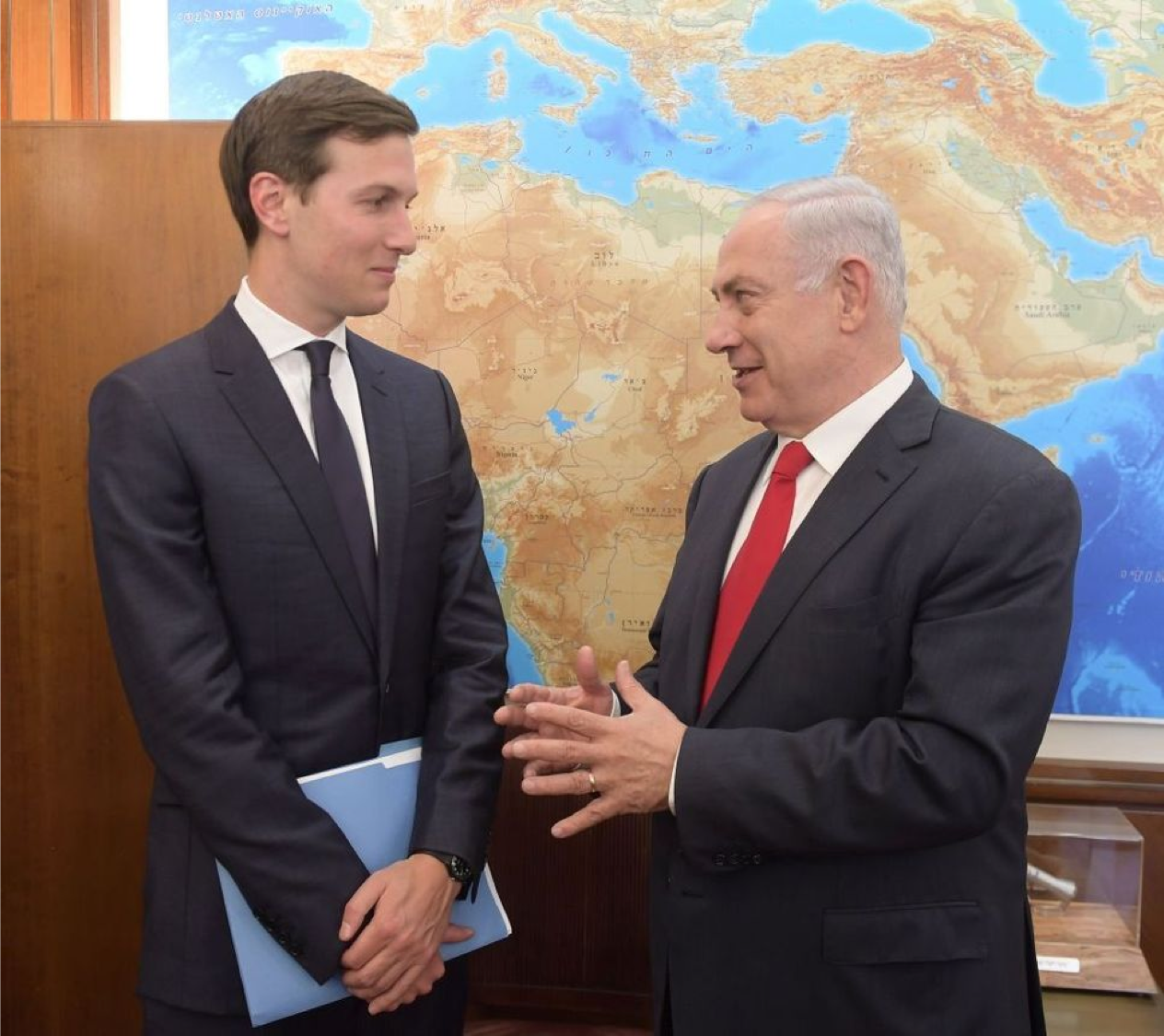 Netanjahu und Jared Kushner vor einer Karte: Wo geflüsterte Strategie zu Staatskunst wird.