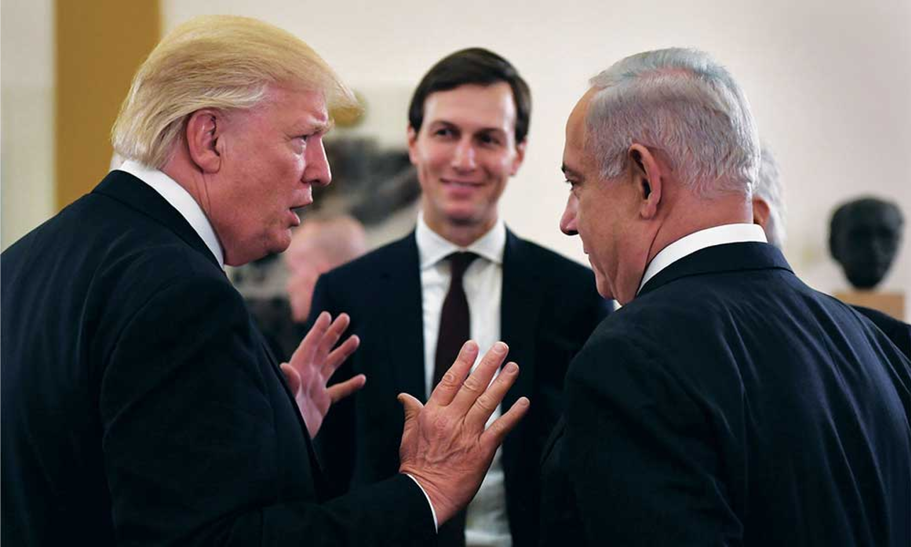 Donald Trump argumentiert Politik; Benjamin Netanjahu und Jared Kushner beobachten mit ominösem Lächeln - Rat, der zu Befehlen wurde.