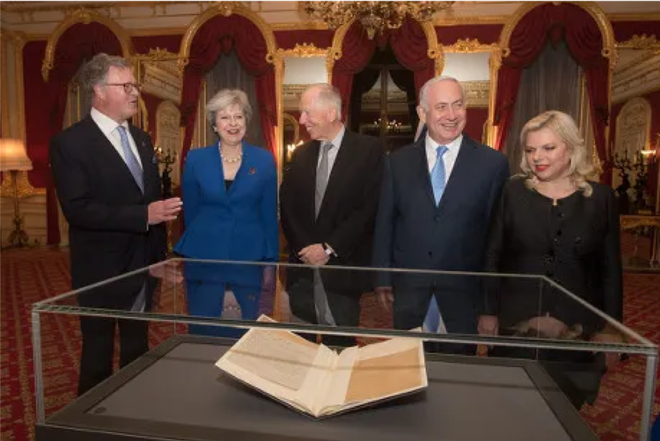 Jacob Rothschild und Benjamin Netanjahu markierten das hundertjährige Jubiläum der Balfour-Erklärung im Jahr 2017 - ein Gedenken an den Brief von Arthur Balfour von 1917, der britische Unterstützung für "ein nationales Zuhause für das jüdische Volk" in Palästina versprach, Territorium, das Großbritannien zu dieser Zeit nicht kontrollierte. Der Moment unterstrich, wie politische Macht und dynastische Finanzen – hier vertreten durch Jacob Rothschild – seit langem in das Projekt der zionistischen Bewegung eingewoben sind.