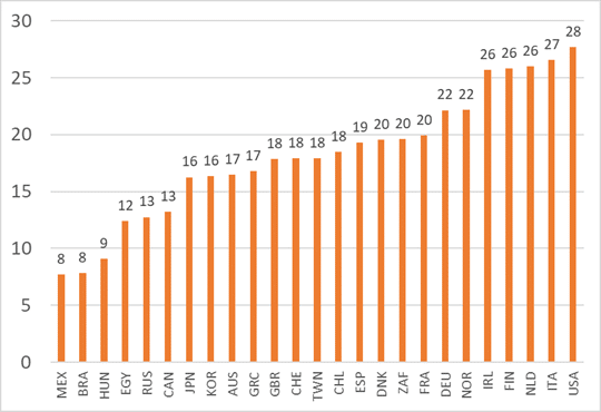 Dieser neue Kapitalismus ist in allen fortgeschrittenen Ländern zu beobachten. Die nachstehende Abbildung, die auf der Grundlage der Daten der Luxemburger Einkommensstudie (LIS) berechnet wurde, zeigt den prozentualen Anteil der Menschen im obersten Einkommensdezil, die homoplutisch sind: Der Anteil reicht von fast 30% in den USA und Italien bis zu 16% in Japan und Südkorea. In den weniger fortgeschrittenen kapitalistischen Ländern (Ungarn, Brasilien, Mexiko) liegt er jedoch unter 10%. Übrigens, und das könnte wichtig sein, zeigen die Daten für China, dass der Anteil der Homoplutiker dort im Jahr 2013 mit 32% höher war als in allen anderen Ländern.