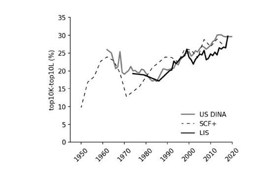 Das nachstehende Diagramm aus einer Arbeit von Yonatan Berman und mir dokumentiert dies anhand von drei verschiedenen Datenquellen: dem US Current Population Survey, der führenden US-Einkommenserhebung (standardisiert durch Luxembourg Income Study, LIS), dem Survey of Consumer Finances (eine Erhebung, die sich sowohl auf die Vermögens- als auch auf die Einkommensverteilung in den USA konzentriert) und den Distributional National Accounts (DINA), die ursprünglich von Thomas Piketty, Emmanuel Saez und Gabriel Zucman entwickelt wurden und Steuer-, Umfrage- und VGR-Daten kombinieren.