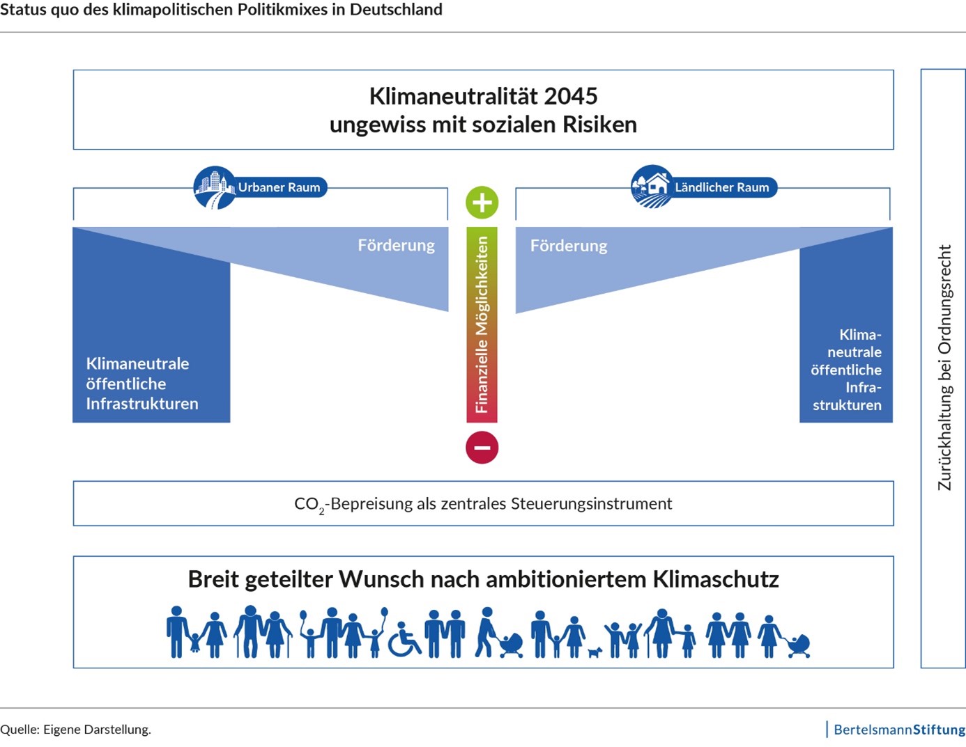 Eine Klimapolitik, die in erster Linie mit steigenden Lebenshaltungskosten, ökonomischer Unsicherheit oder einem Gefühl der Überforderung verbunden wird, wird auf Dauer kaum mehrheitsfähig in der Gesellschaft sein. Daher braucht es deutliche Anpassungen im Politikmix, um die Akzeptanz der Bürgerinnen und Bürger für die Dekarbonisierung unseres Landes zu sichern. Der Grundgedanke einer ambitionierten und gesellschaftlich breit getragenen Klimapolitik muss es sein, allen Mitgliedern der Gesellschaft die Klimaneutralität zu ermöglichen.